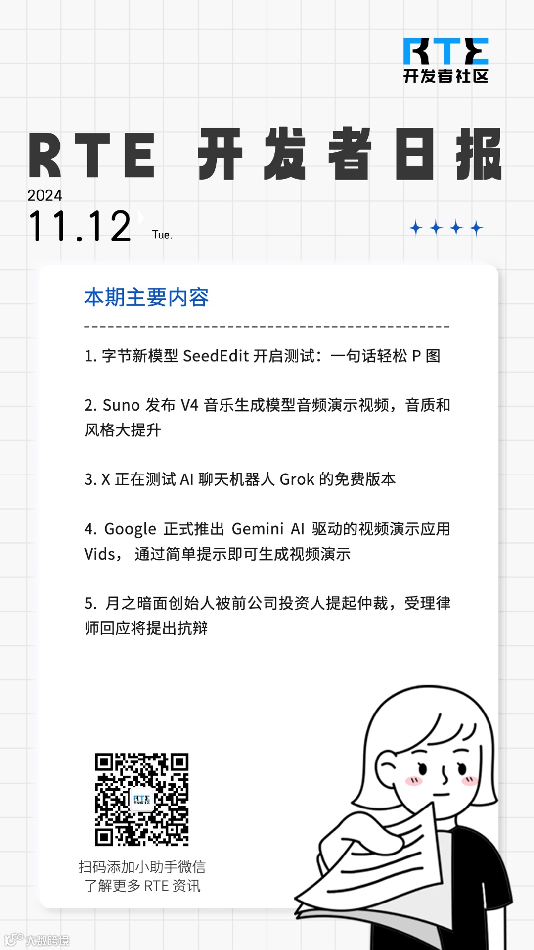 字节跳动于 11 月 11 日推出了其最新图像编辑模型 SeedEdit,成为国内首个产品化的通用图像编辑工具。用户只需输入一句简单的自然语言指令,即可实现对图片的背景更换、风格转换以及元素的增删替换,无需繁琐的描边和涂抹。