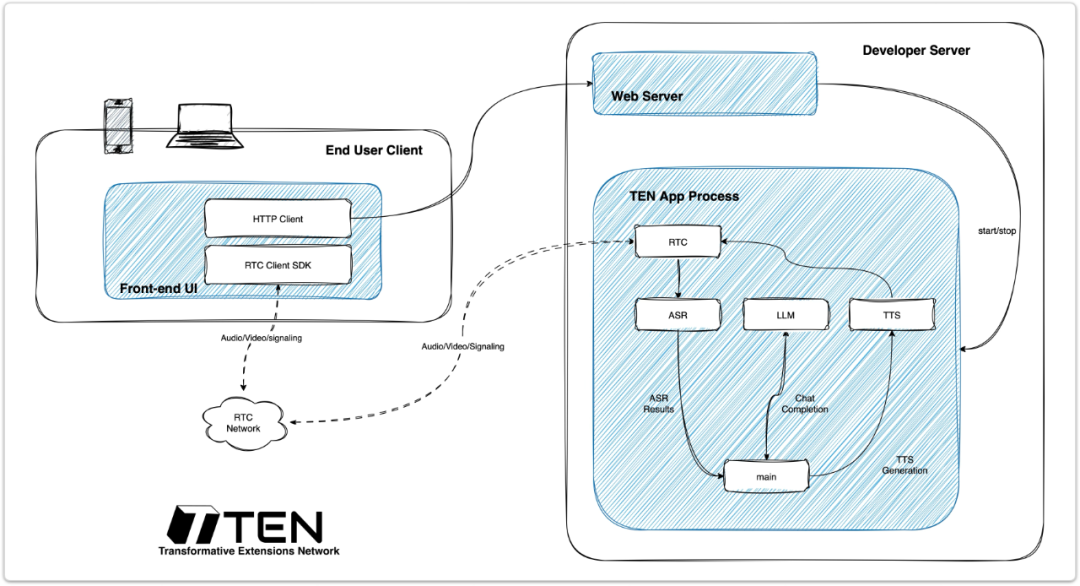 TEN Framework 是一个主流对话式 AI 开源框架,由声网与社区共同支持。基于 TEN Framework,你可以搭建任何可用于生产环境的对话式 Voice Agent。