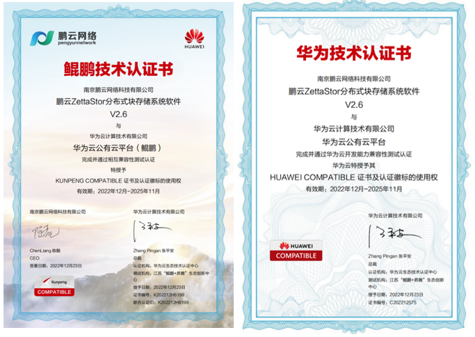 鹏云网络与华为的自2019年就开始了技术的合作互认,至今已达成分布式块存储、分布式对象存储等多项产品的兼容性测试认证。