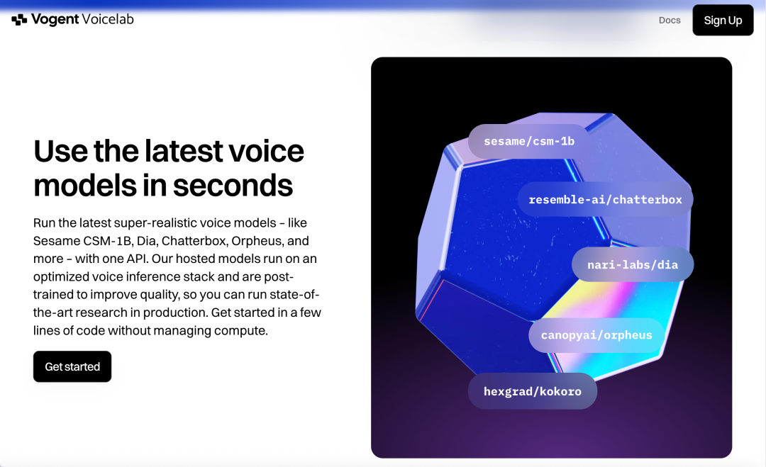 Vogent Voicelab 通过优化每个模型的推理过程,让用户能够快速、可扩展地运行顶级开源语音模型,例如 Sesame CSM-1B 和 Dia 等。