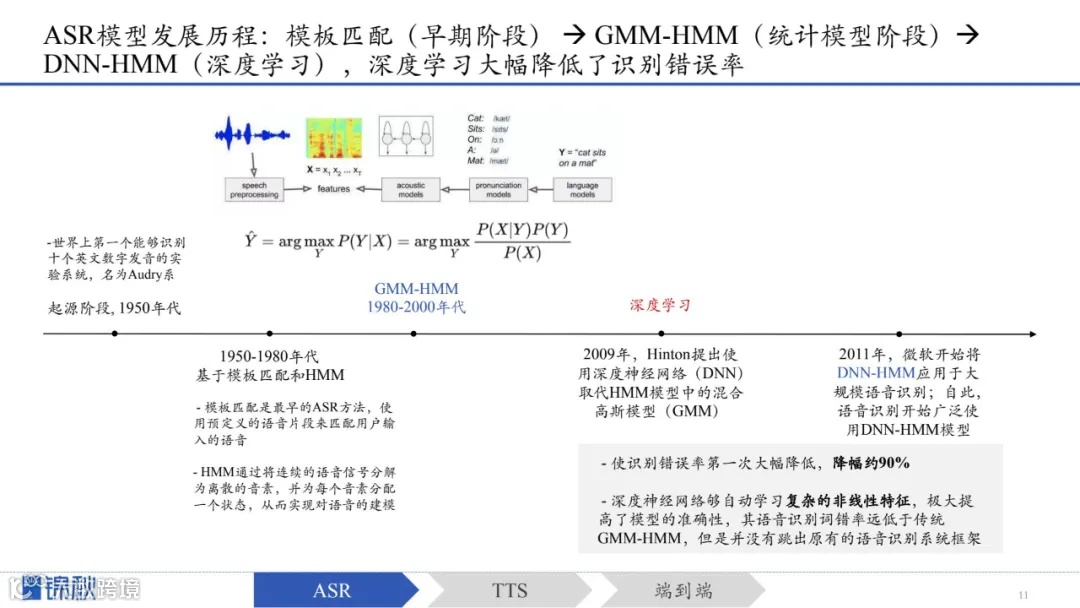 深度学习阶段:自2009年Hinton提出使用DNN取代GMM后,DNN-HMM大规模应用