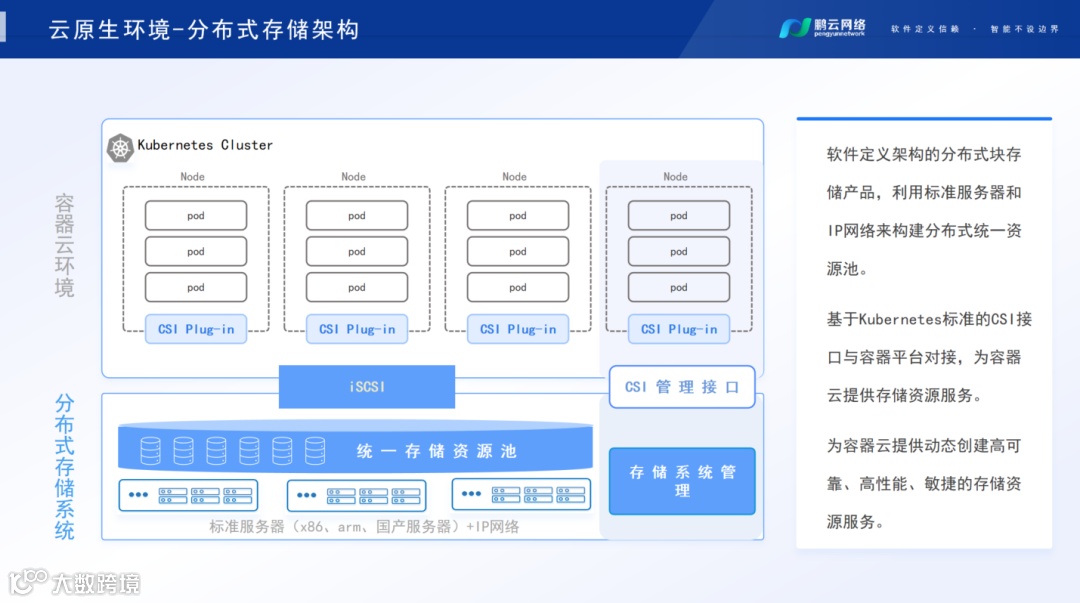 我们在底下一层,利用标准服务器和IP网络来构建分布式统一资源池,资源池的好处就是实现数据流通,有了资源池以后,数据不再是孤立的。上层应用不需要进行任何更改,即可基于Kubernetes标准的CSI接口与容器平台对接,为容器云提供存储资源服务。