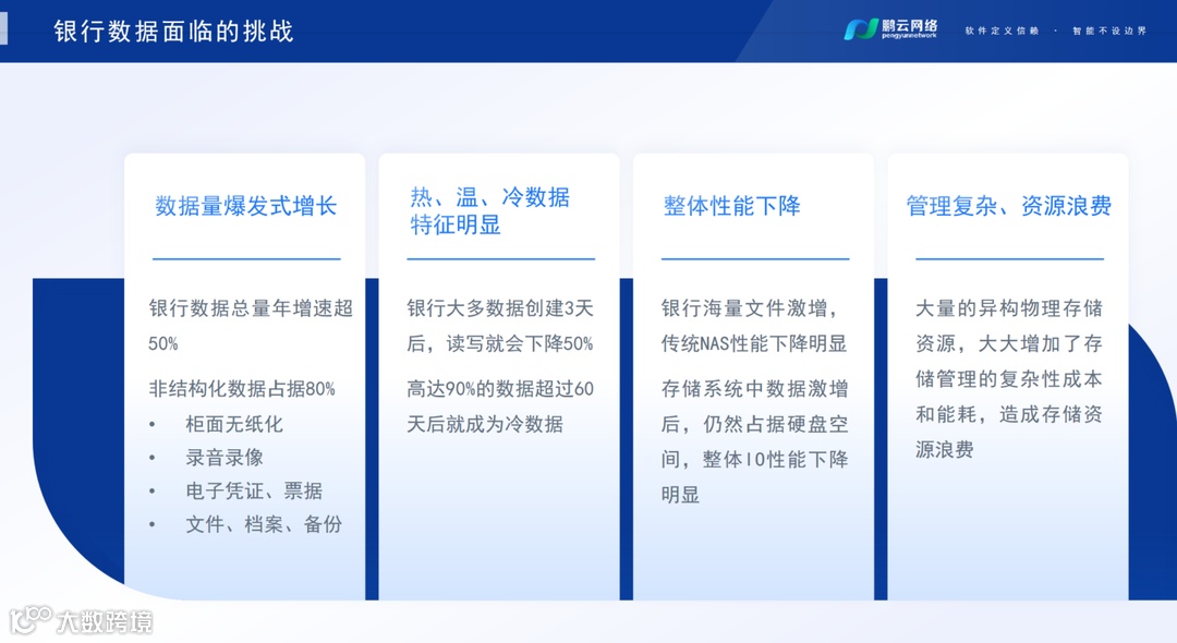 我们在帮助客户去解决问题的时候,发现了几个银行数据面临的挑战。第一个是面对数据量爆发式增长现象,解决大数据量存储的问题。