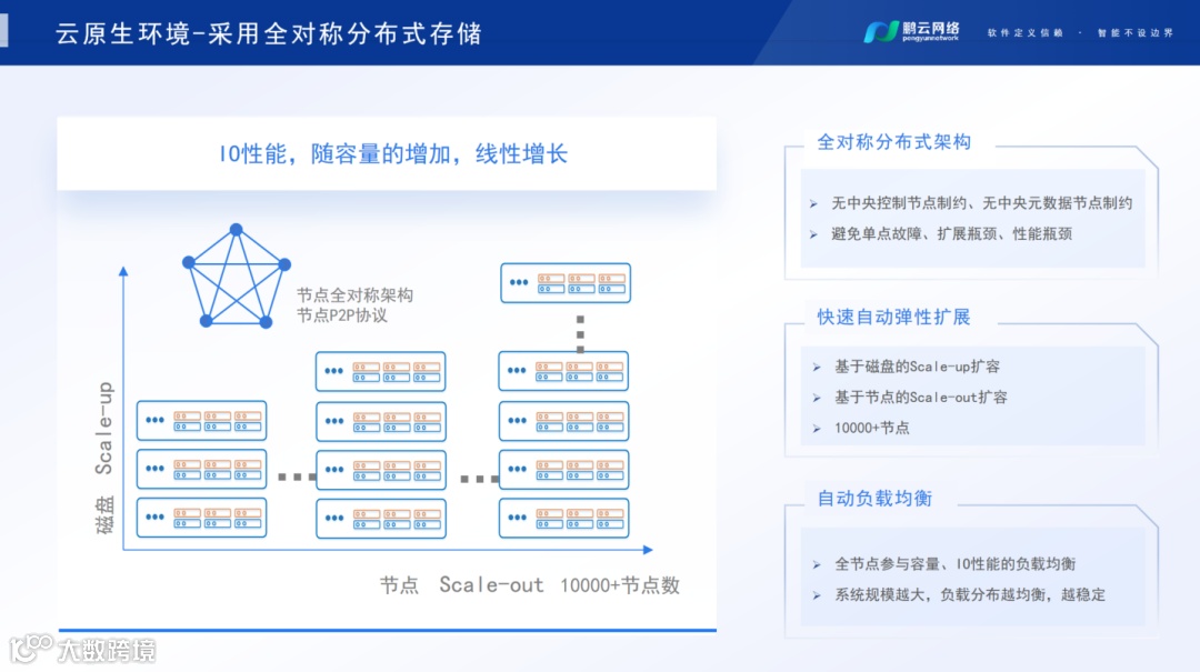 其实目前分布式存储市场较为鱼龙混杂,有这种架构的并不多,鹏云的存储产品则完全是这种全对称分布式架构。基于此架构的存储系统可实现快速自动扩展,比如说银行的业务量在某一时刻陡增,怎么能够快速将机器加进来、将资源快速加进去?这就需要看其扩展能力。