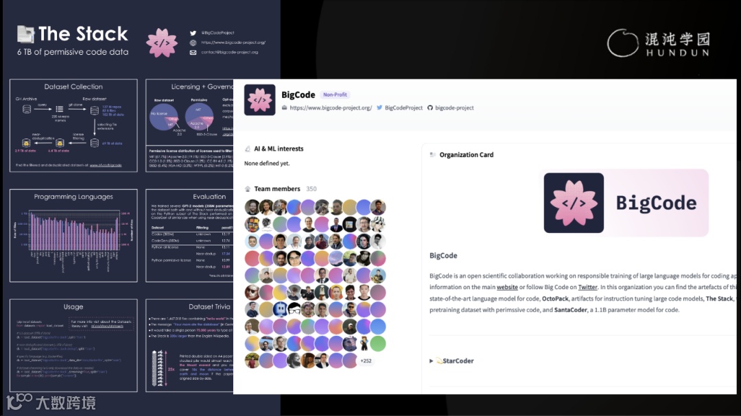 比如,去年年终的时候GPT-3出来了,这个模型特别火,但OpenAI也在那个时候就决定不开源了,这对开源社区来说实际上是一个非常大的打击。所以我们也与几位合作伙伴共同推动了BigScience项目,我们发布了BLOOM这个最早在100B以上、支持多语言的开源模型。在商业授权方面,BLOOM几乎没有任何限制。它不仅授人以鱼,更是授人以渔。我们走过的所有弯路、积累的所有经验都公开到开源社区之中,为后来者提供了一个示范。