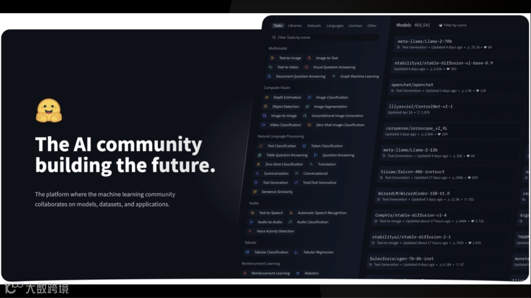 Hugging Face的Transformers库是最快超100k的GitHub项目;迄今为止社区成员总共分享了超过 423k 个模型公开模型和超过84k 个公开数据集;有超过5万家组织使用Hugging Face;它不仅开发了Transformers库(目前最受欢迎的大语言模型库),也提供了各种构建、部署和训练机器学习模型的工具和资源……