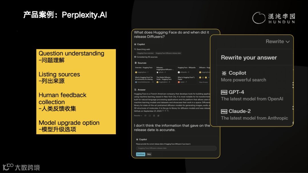 非常早期的时候,我们做了一个Transformer Agent,它从用户那里拿到一个指令之后,会从我们给它提供的一些给定的工具中进行选择,再生成一段代码来调用这个工具,最后完成任务。再来看看现在的产品,以Perplity.AI为例,我同时问了它两个问题,一是Hugging Face是做什么的,二是它什么时候发布了Diffusers这个库。它就会使用工具拆解我的问题,然后从数据库里找到16条资料,最后从资料中提炼出一个最终回答。尽管我发现它给出了错误的回答,但是我可以给它一个反馈,这就是所谓的人在回路。