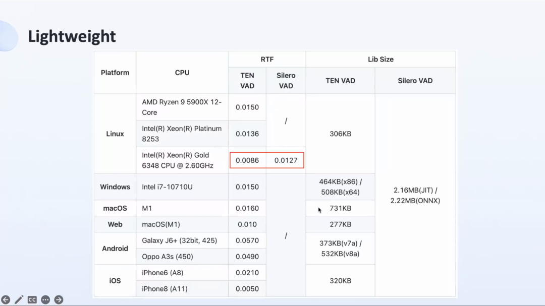 在性能方面,我们对比了 Lib Size 和 RTF(Real-Time Factor,处理一秒音频所需时间,越小越好)。在 Linux (Intel 6348) CPU 上的测试结果显示:TEN VAD 的 RTF 为 0.0086,即处理一秒音频需 8.6 毫秒,优于 Silero VAD 的 12.7 毫秒。此外,TEN VAD 模型大小仅几百 KB,远小于 Silero VAD 的两兆多。我们已开源 ONNX 模型和预处理代码,方便大家部署到各类硬件平台和架构上。