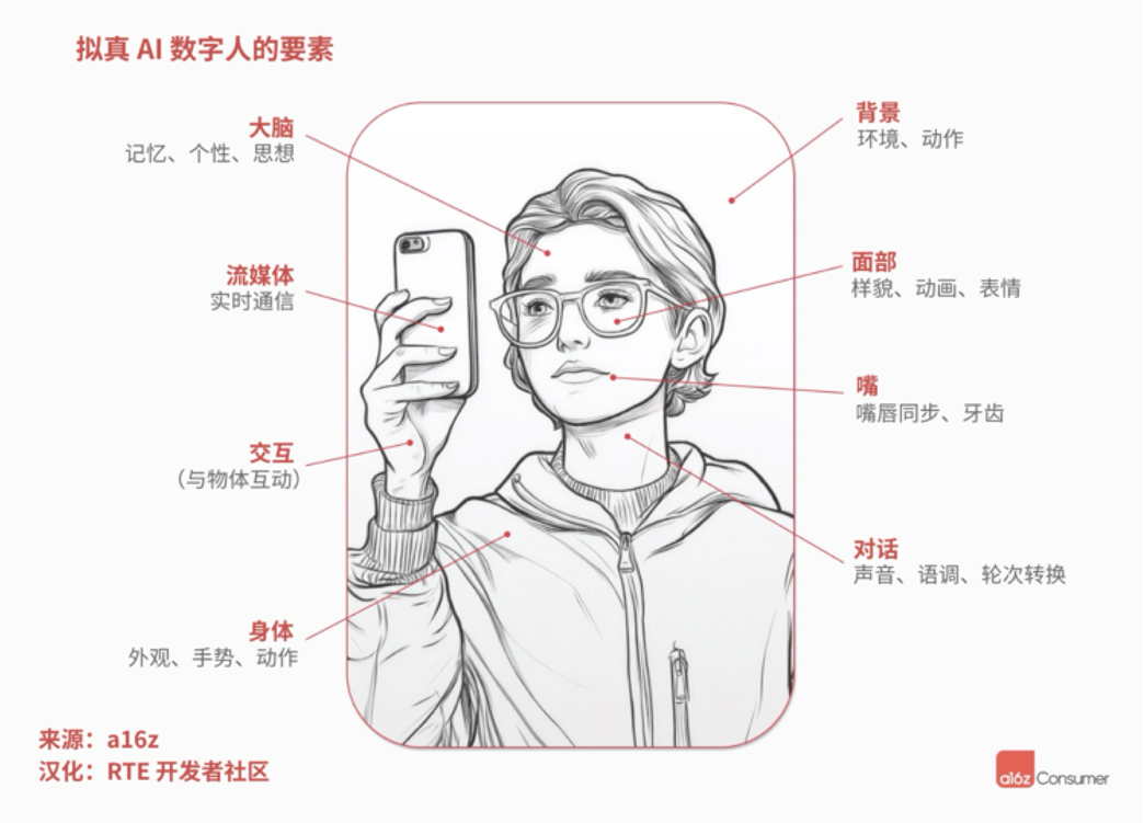 a16z 在《AI 数字人跨越「恐怖谷」》(AI Avatars Escape the Uncanny Valley)一文中提到了创建 AI 数字人的要素,Agora、ElevenLabs、字节跳动的 OmniHuman 等被列为核心要素技术能力。