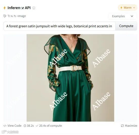 例如输入「一件森林绿色缎面连身裤,宽腿,金色植物印花,系着米白色腰带的束腰,不对称领口,半透明叶形斗篷,袖口有工业细节,时髦的街头风剪裁」,模型很快就返给一张时尚的服装设计图。