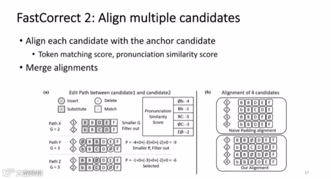 这里有一个细节,就是如何将多个句子 Align 起来,使它有更准确的对应关系,对此我们任意找一个 anchor 的 candidate,然后使其他的句子都与该句进行对齐,这里的细节不过多介绍。这个对齐方法实际上和 FastCorrect 1 中介绍的一样,就是先计算编辑距离,然后得到编辑的 path 并从这个 path 中选择比较合理的对齐关系。也就是说,使每一个句子都和 anchor 句子 align 起来之后,就会得到所有句子和这个 anchor 句子的对齐关系,最后把这个 candidate merge 起来,就形成了一个多路的对齐。对齐以后就可以作为模型的输入。