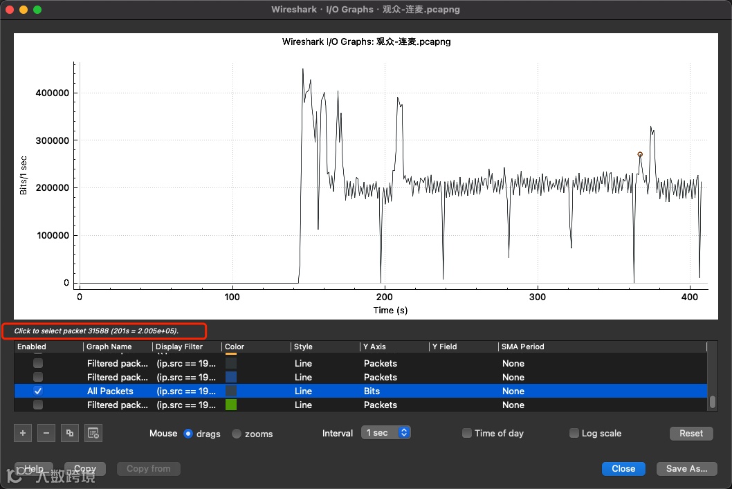 6、复制过滤条件,点击统计,将复制的过滤条件粘贴到显示过滤器一栏中,显示出所抓数据的 I/O 图,便可得到实时通讯的带宽大小(如图 12)