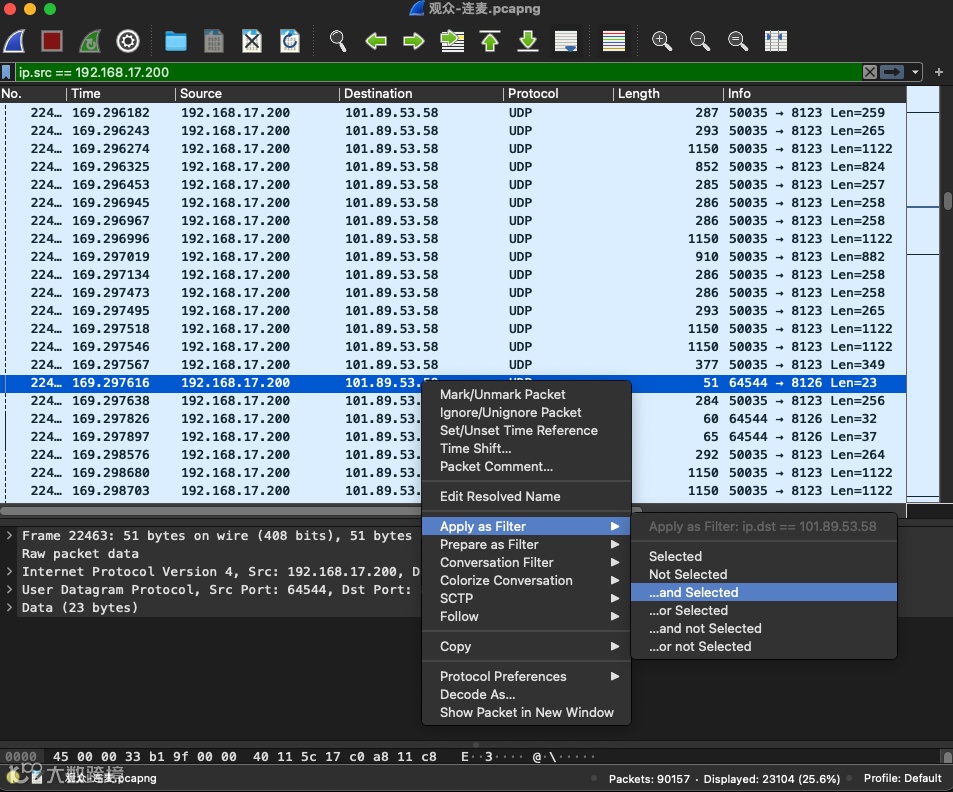 5、选中发送端(本机)和接受端(服务器)的 ip,一般 Source 出现频率最高为本机 ip,Destination 出现频率最高为服务器 ip。(如图 10 和 11);