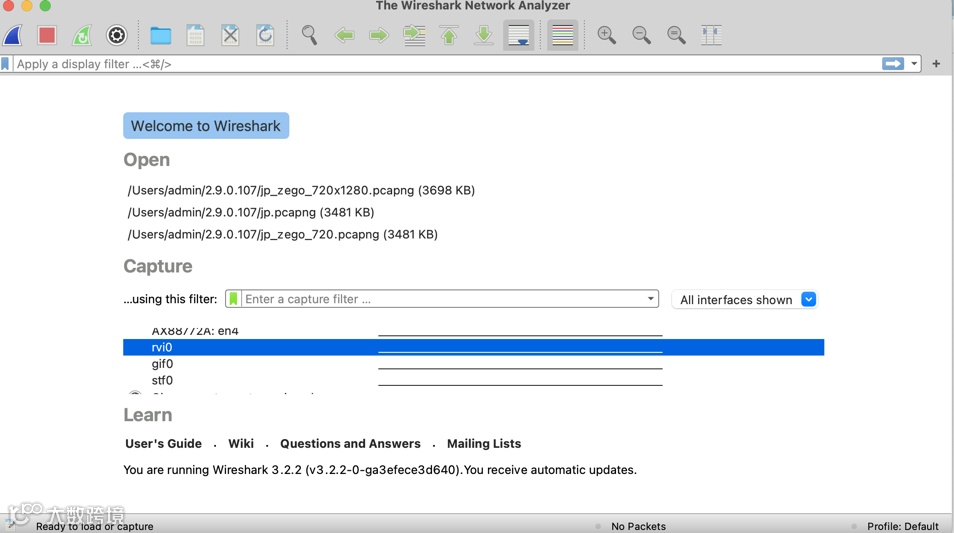 3、打开 wireshark ,在 capture 中选择刚才生成的接口名(例图 9 为 rvi0);