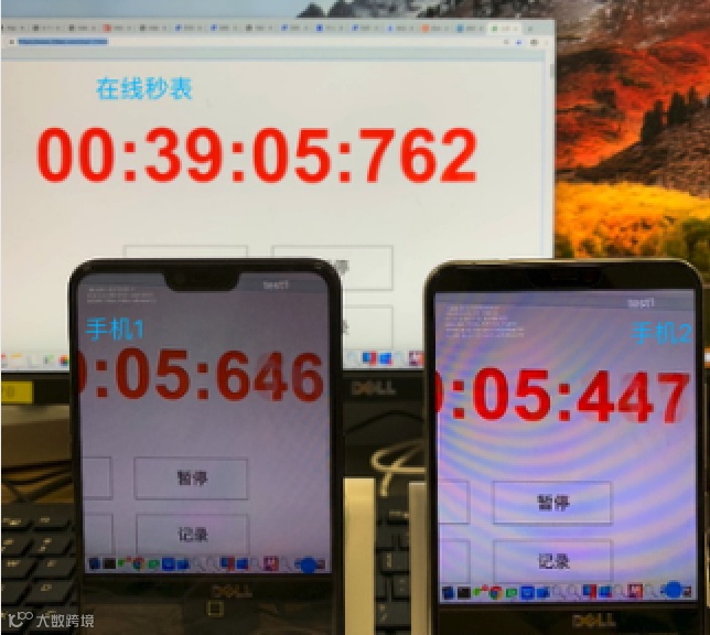 2、找一个设备打开精度为 ms 的在线秒表或秒表,将设备 1 后置摄像头正对着秒表,摄像头采集秒表的数字,设备2上能清晰地看到设备 1 发送过来的秒表数字,具体摆放位置如下图 1 所示。