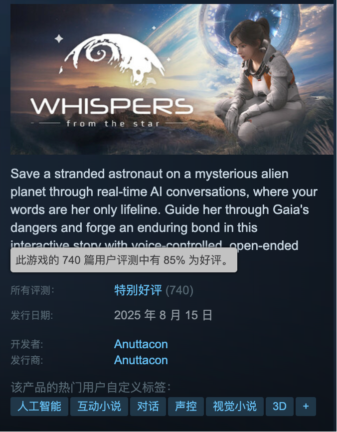 米哈游创始人蔡浩宇(身价超 500 亿)创立的 Anuttacon 公司推出首款 AI 游戏《Whisper from the Stars》(星之低语),Steam 首发价 27 元。尽管团队豪华(成员来自米哈游、微软、Meta 等),但上线首日峰值在线仅 964 人,一周后跌至 139 人,远未达「爆款」预期。