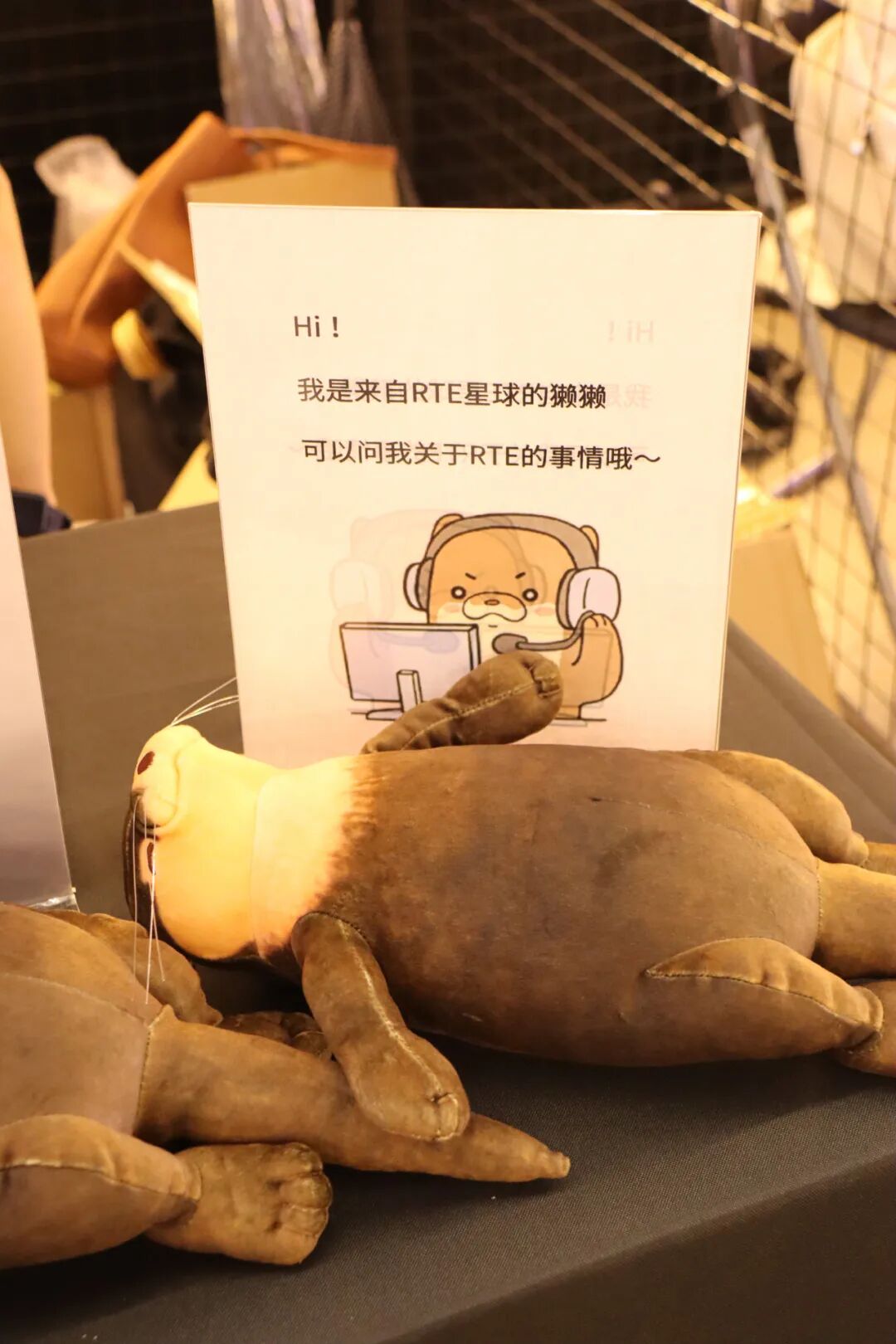 超音速吉祥物、社区大明星小音符獭獭这两天也得上班营业。这两只由 FoloToy 帮助定制的社区小音符獭獭提前“学习”了很多 RTE 相关的知识,在现场担当临时客服。但是它被问最多的一句话是:“可以卖吗?”