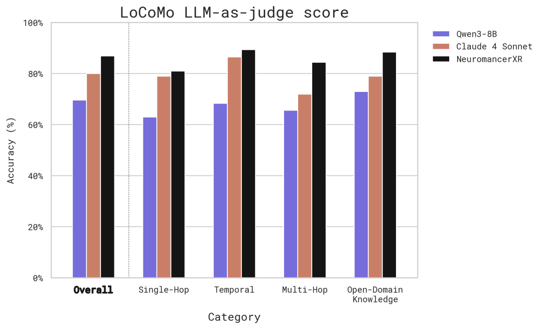 在技术层面,Neuromancer XR 的卓越性能源于一项关键的训练策略:通过在约 1 万条人工整理的结论推导轨迹上对 Qwen3-8B 模型进行微调,它能够生成自包含且便于检索的结论,从而有效地进行上下文综合。基于该模型,Honcho 在 LoCoMo 评估中取得了 86.9% 的最先进准确率。