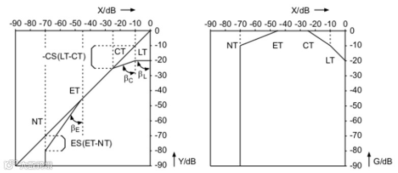 既然是压缩肯定就会涉及语音失真,失真的程度和压缩自身动态范围的大小、快慢,以及语音本身的稳定性、保真度都有关。压缩的原理相对也比较简单,声音小一点的把声音提高一点,声音大一点的把声音压小一点,一般会有标准分贝压缩曲线,类似下图所示。