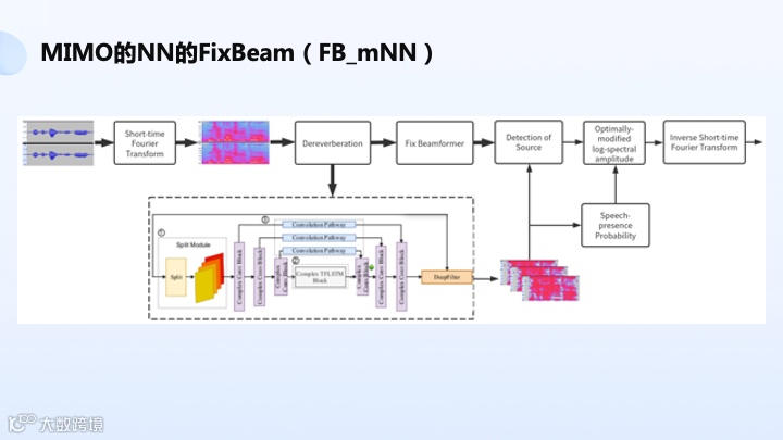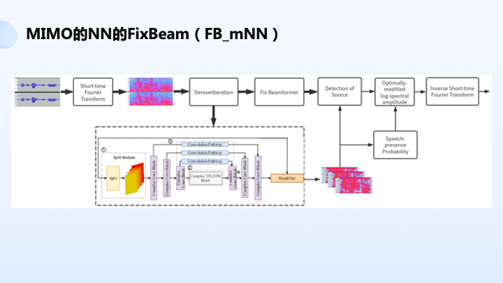 我要提一下,本身这个链路包含了去混响、固定波束设计和神经网络 mask 估计,其中固定波束设计是固定方向的波束设计,可以采用自适应的方案,这时候神经网络本身也能对整个学习过程做一些指导。