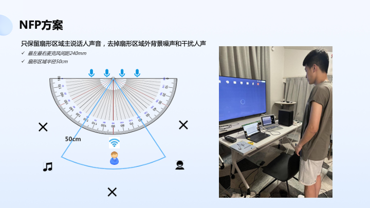 另外一个我们做比较有意思是 NFP 方案,解决的是可以有效地去除说话目标区域以外的声音,比如扇形区以外的声音,左面、右面和后面的声音,主要面向的是个人办公产品,可以有效去除嘈杂环境下的声音。