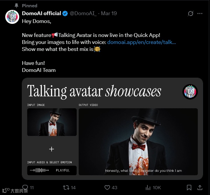 1、DomoAI 宣布新功能,将图像与语音文件结合,快速生成具有自然语言表达能力的虚拟人物