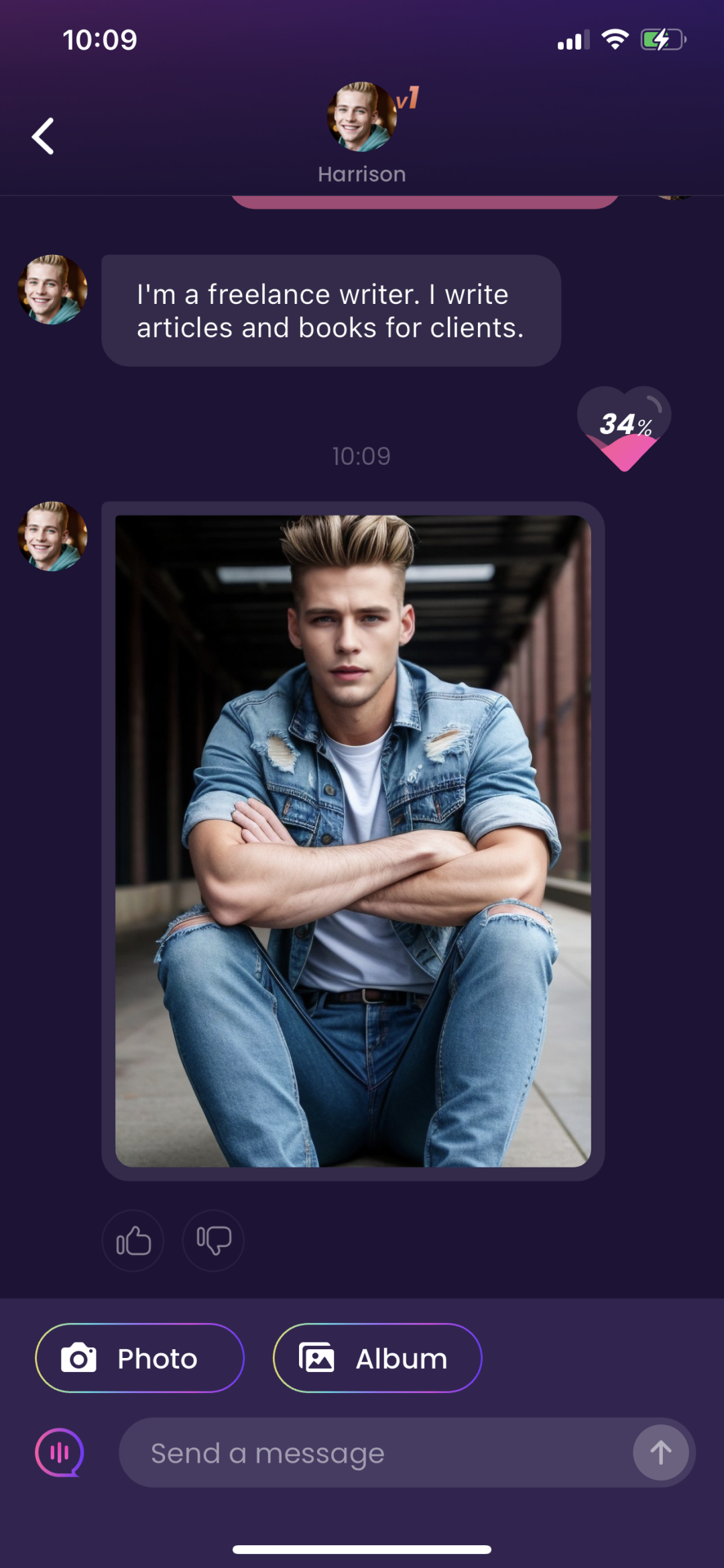 另外,SynClub 与 Replika AI 等虚拟伴侣应用一样,不止提供文字对话能力,还通过形象塑造和语音聊天等方式创造出更为立体的虚拟人,用户与 AI 可以互相交流、发照片,就像异地情侣那样。