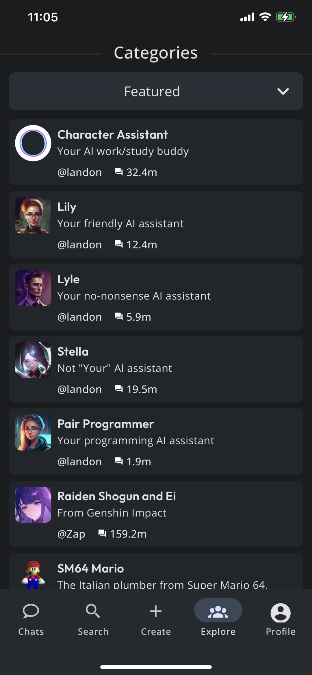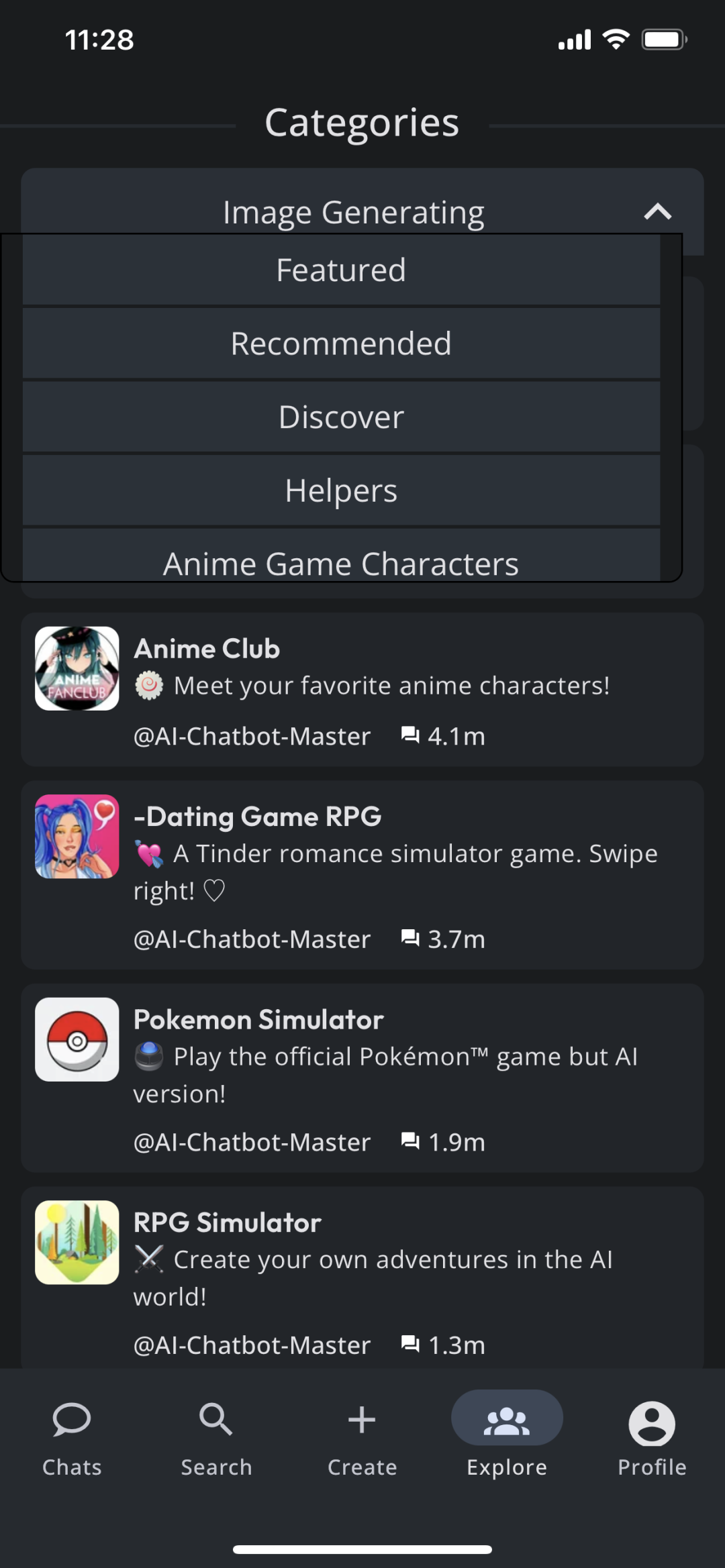 此外,还有 Game、Anime、Comedy、Image Generating 等数十个类别的 1600 万个聊天机器人,他们由 500 万用户创建。