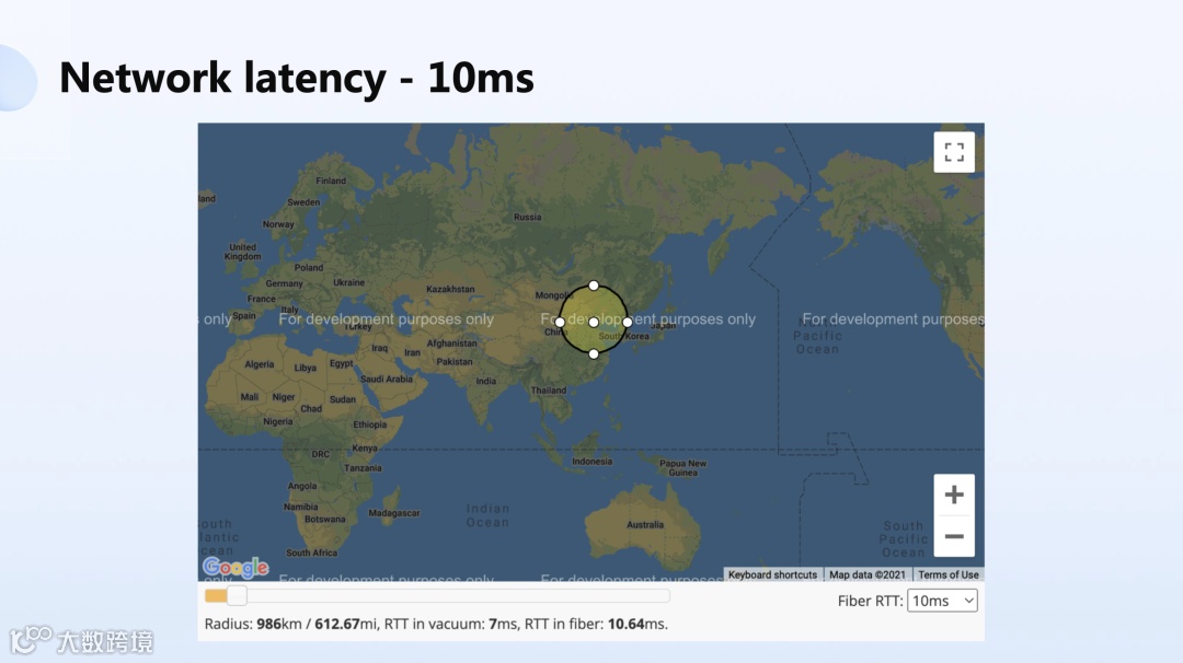 如图所示,50 毫秒的时延理论上可以实现覆盖亚洲和东欧的部分;100 毫秒的时延,如果将数据中心部署在美国的东部,理论上是可以覆盖半个地球的,但实际环境中其实根本做不到这一点。