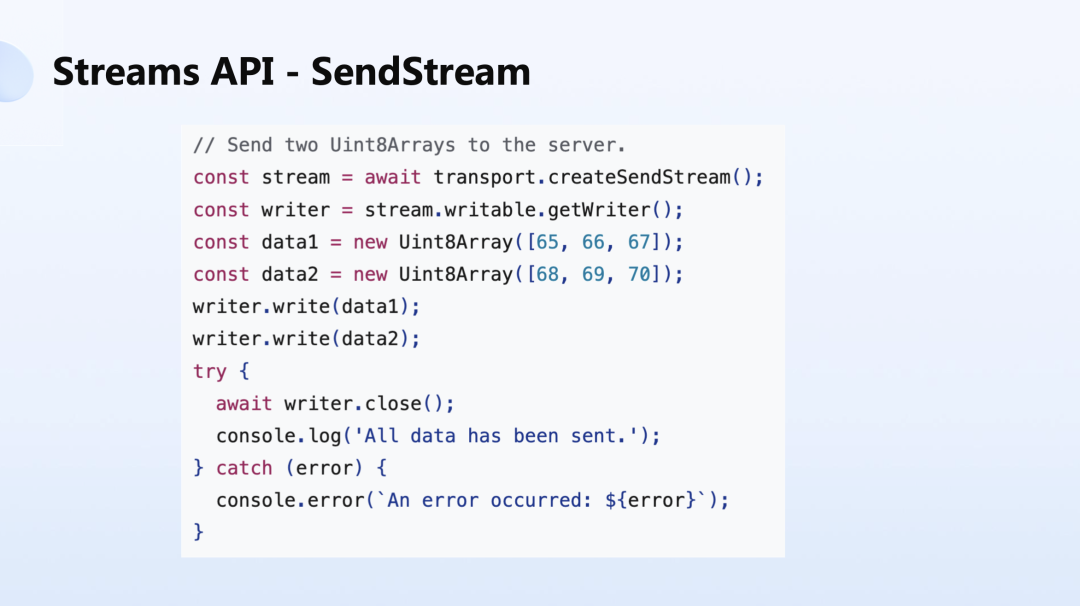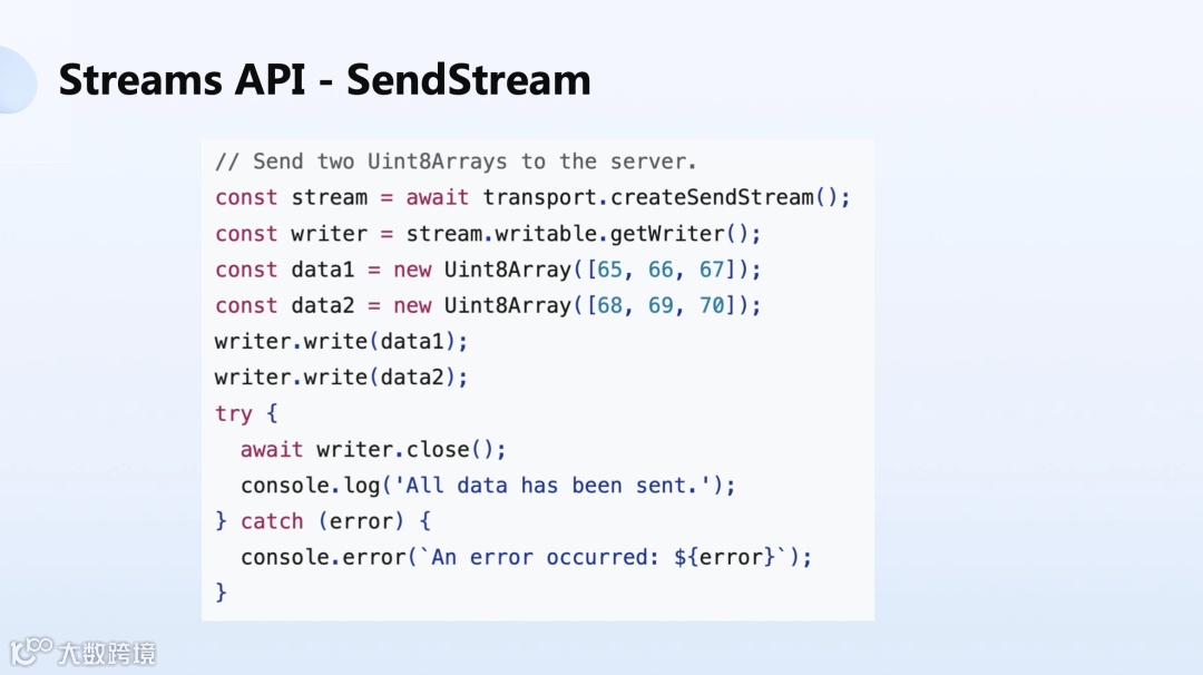 上图所示是如何发数据到 WebTransport。能看到需要先创建一个 SendStream,然后拿到这个 Stream 要去 getWriter。第二行、第三行、第四行是要准备好我的数据要按照 Uint8Array 的形式准备好,然后要把它 write 过去,还要去看控制 error 的问题。