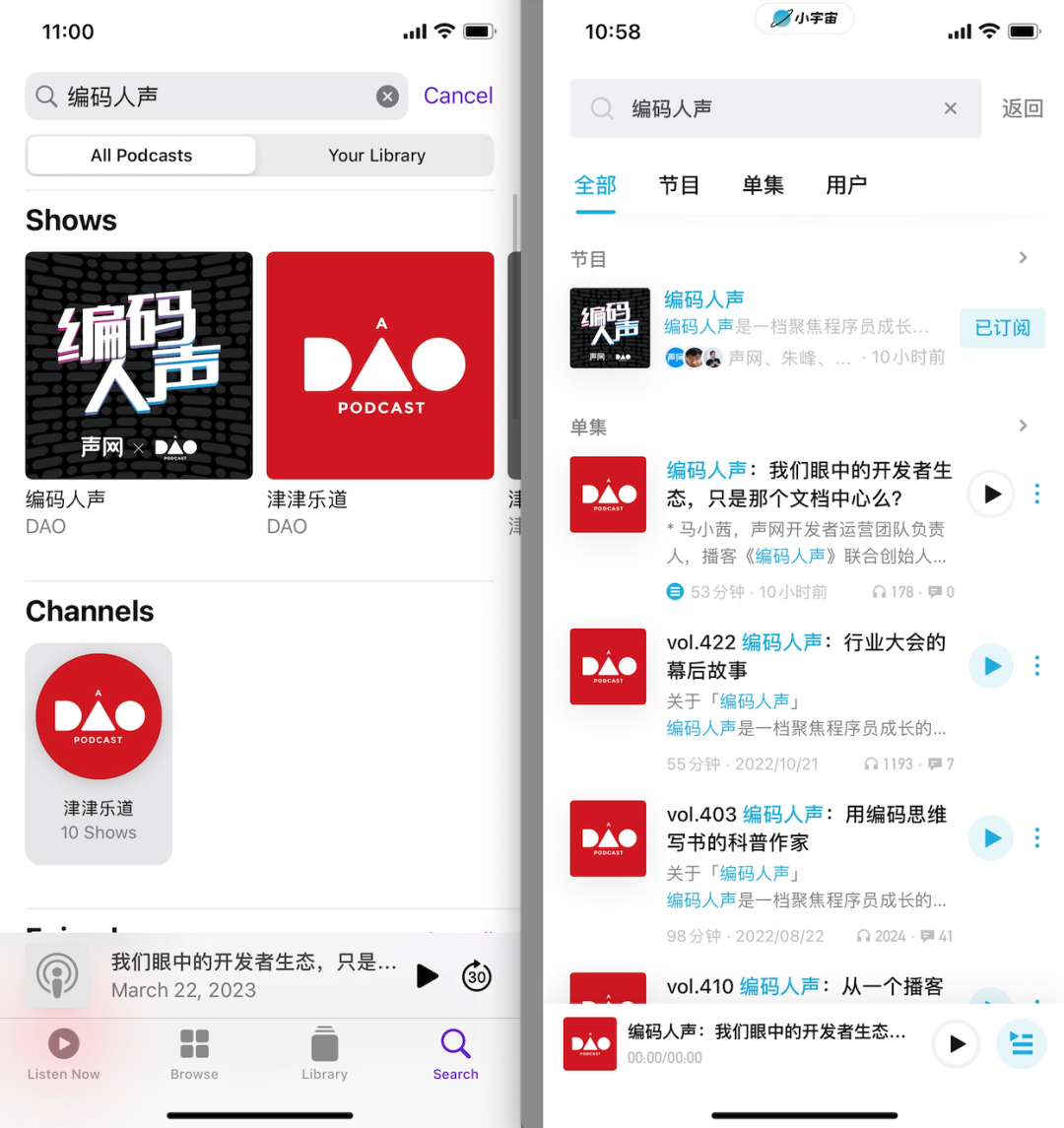 最简单的方式,就是下载播客 App,例如支持 Android 和 iOS 平台的小宇宙 App、汽水儿 App,以及 iOS 自带的“播客”App。在 App 中搜索“编码人声”,即可订阅收听。