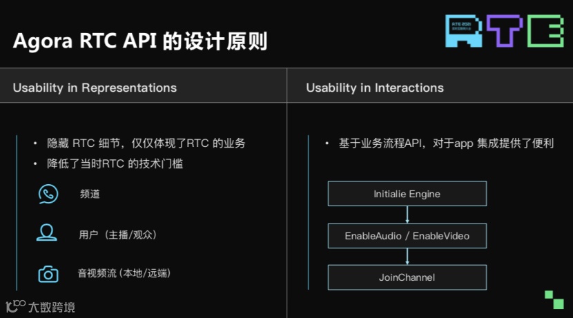 所以易用性是第一代 API 设计的原则。首先在 API 表现层上,尽量的隐藏 RTC 细节,仅仅体现了 RTC 的业务,依赖频道、用户(主播/观众)、音视频流(本地/远播)的概念,降低了 RTC 的技术门槛。其次,而在API 交互上,提供了基于客户业务流程 API,让没有专业背景的人也能读懂 API 业务意图,对 App 集成提供了便利。