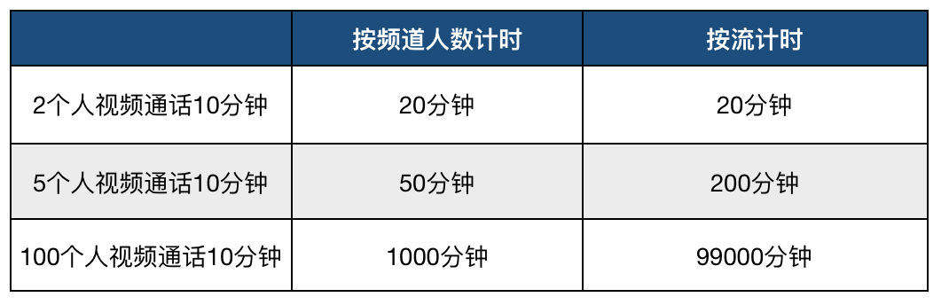 事实上,RTC 领域,也有另外一种常见的计时方式,那就是“按流计时”。这种计时方式,是以频道内每个人接收的每路音频、视频流都纳入进来进行计时,也就是时长按所有接收端用户的通话时间叠加计算。