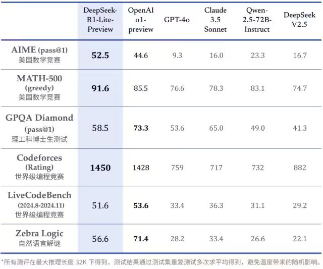 DeepSeek-R1-Lite 预览版模型在美国数学竞赛(AMC)中难度等级最高的 AIME 以及全球顶级编程竞赛(codeforces)等评测中,超越了 GPT-4o 等知名模型。