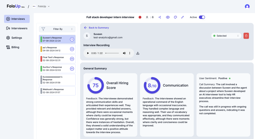 智能分析:通过先进的人工智能,为每个面试回答提供详细见解和评分。