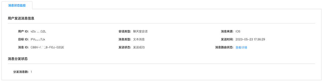 通过消息流转状态,可以查看一条单群聊消息的目标用户接收情况,包括消息是否发送成功、敏感词、黑名单过滤情况及目标用户未在线时的消息推送状态。