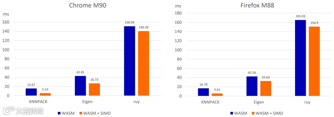 由于 TFlite 在 Web 平台采用 WebAssembly 移植实现,而 WebAssembly VM 环境和真实系统架构存在较大区别。这就需要对支撑 TFlite 运算的不同矩阵/向量运算后端框架的性能进行评估。TFlite 提供了 XNNPACK、Eigen、ruy 三种矩阵运算后端。经分析对比他们在 WebAssembly 下单帧推理时间表现如下:
