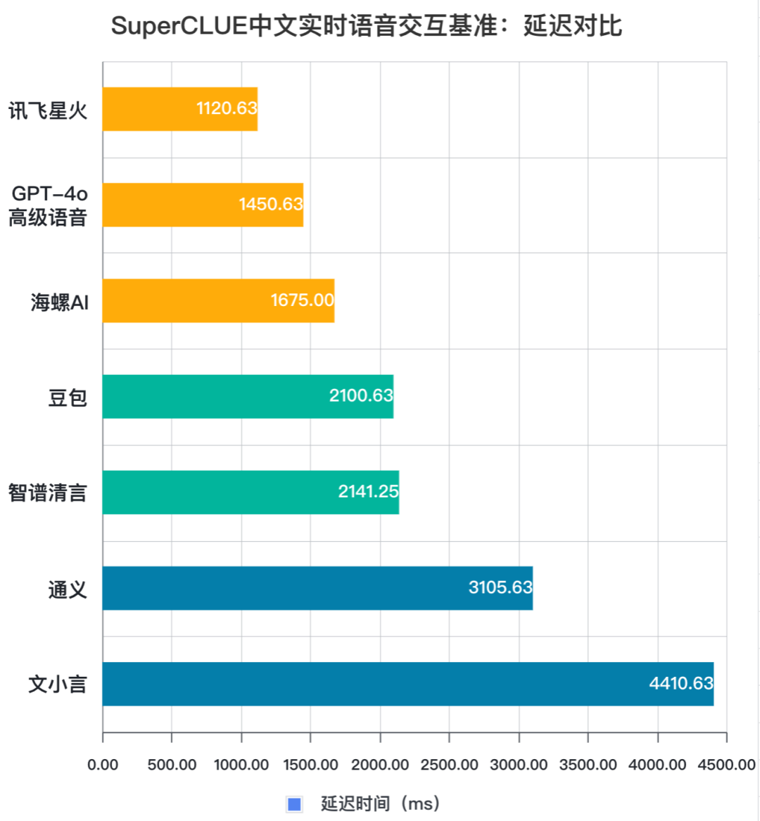 根据测评结果的延迟时间数据可以发现,不同实时语音产品的响应速度差异较大。表现最好的是讯飞星火有1121ms的平均延时,较GPT-4o高级语言平均延时少330ms,展现出科大讯飞对语音核心技术的持续积累。海螺AI紧随其后同样有小于2000ms的表现。