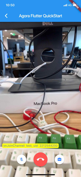 class _CallPageState extends State{ final _users =[]; final _infoStrings =[]; bool muted = false;late RtcEngine _engine;...Toolbar layoutWidget _toolbar() {if (widget.role == ClientRole.Audience) return Container();return Container(alignment: Alignment.bottomCenter,padding: const EdgeInsets.symmetric(vertical: 48),child: Row(mainAxisAlignment: MainAxisAlignment.center,children:[ RawMaterialButton(onPressed: _onToggleMute,child: Icon(muted ? Icons.mic_off : Icons.mic,color: muted ? Colors.white : Colors.blueAccent,size: 20.0,),shape: CircleBorder(),elevation: 2.0,fillColor: muted ? Colors.blueAccent : Colors.white,padding: const EdgeInsets.all(12.0),),RawMaterialButton(onPressed: () => _onCallEnd(context),child: Icon(Icons.call_end,color: Colors.white,size: 35.0,),shape: CircleBorder(),elevation: 2.0,fillColor: Colors.redAccent,padding: const EdgeInsets.all(15.0),),RawMaterialButton(onPressed: _onSwitchCamera,child: Icon(Icons.switch_camera,color: Colors.blueAccent,size: 20.0,),shape: CircleBorder(),elevation: 2.0,fillColor: Colors.white,padding: const EdgeInsets.all(12.0),)],),);}Info panel to show logsWidget _panel() {return Container(padding: const EdgeInsets.symmetric(vertical: 48),alignment: Alignment.bottomCenter,child: FractionallySizedBox(heightFactor: 0.5,child: Container(padding: const EdgeInsets.symmetric(vertical: 48),child: ListView.builder(reverse: true,itemCount: _infoStrings.length,itemBuilder: (BuildContext context, int index) {if (_infoStrings.isEmpty) {return Text(// return type can't be null, a widget was required}return Padding(padding: const EdgeInsets.symmetric(vertical: 3,horizontal: 10,),child: Row(mainAxisSize: MainAxisSize.min,children: [Flexible(child: Container(padding: const EdgeInsets.symmetric(vertical: 2,horizontal: 5,),decoration: BoxDecoration(color: Colors.yellowAccent,borderRadius: BorderRadius.circular(5),),child: Text(_infoStrings[index],style: TextStyle(color: Colors.blueGrey),),),)],),);},),),),);}void _onCallEnd(BuildContext context) {Navigator.pop(context);}void _onToggleMute() {{muted = !muted;});_engine.muteLocalAudioStream(muted);}void _onSwitchCamera() {_engine.switchCamera();}@overrideWidget build(BuildContext context) {return Scaffold(appBar: AppBar(title: Text('Agora Flutter QuickStart'),),backgroundColor: Colors.black,body: Center(child: Stack(children:[ _viewRows(),_panel(),_toolbar(),],),),);}}