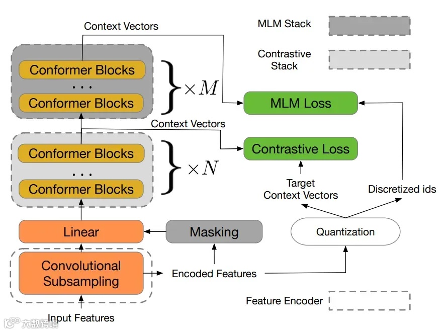 [3] Chung Y A, Zhang Y, Han W, et al. W2v-bert: Combining contrastive learning and masked language modeling for self-supervised speech pre-training[C]//2021 IEEE Automatic Speech Recognition and Understanding Workshop (ASRU). IEEE, 2021: 244-250.