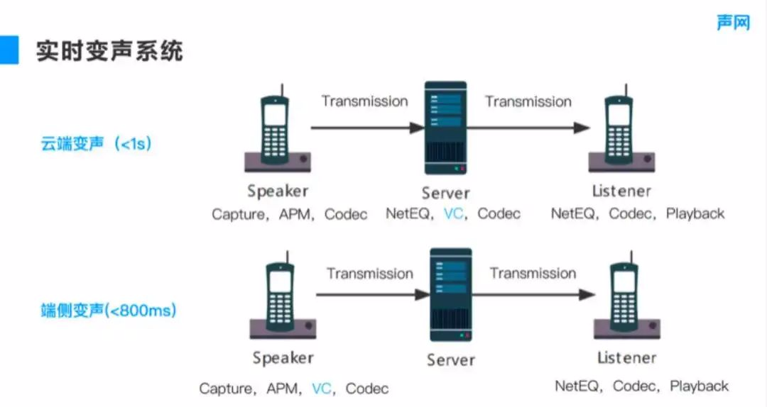 这种形式比端侧实现变声增加了 NetEQ 和服务器上编解码的过程,如果是在没有弱网的情况下,它控制的延迟可能增加 30~40 毫秒。但是如果是在有弱网的情况下,为了抗丢包,延迟可能就会达到 100 毫秒或者 200 毫秒,甚至更高。