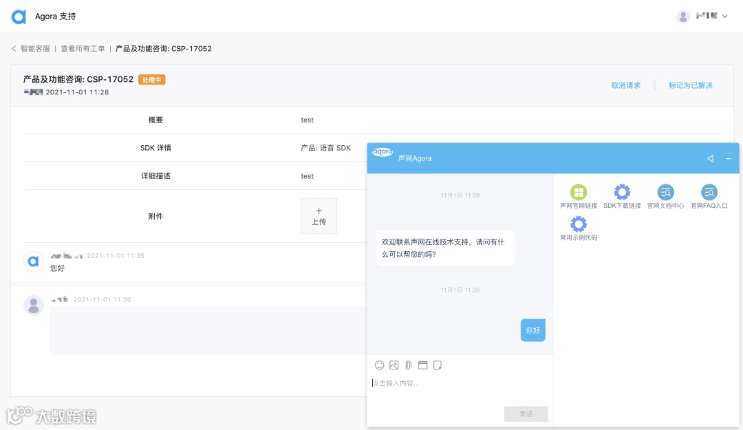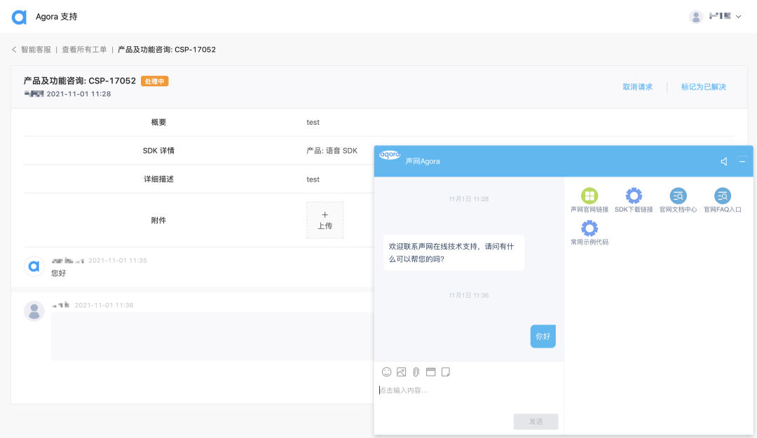 以往来讲,开发者提交工单之后,可以通过类似发帖留言的形式与声网的工程师交流。但是我们发现这种方式比较低效,一方面,开发者不知道什么时候能得到回复;另一方面,我们的工程师也可能没法及时看到新的留言。所以我们在工单系统中增加了聊天对话模块。