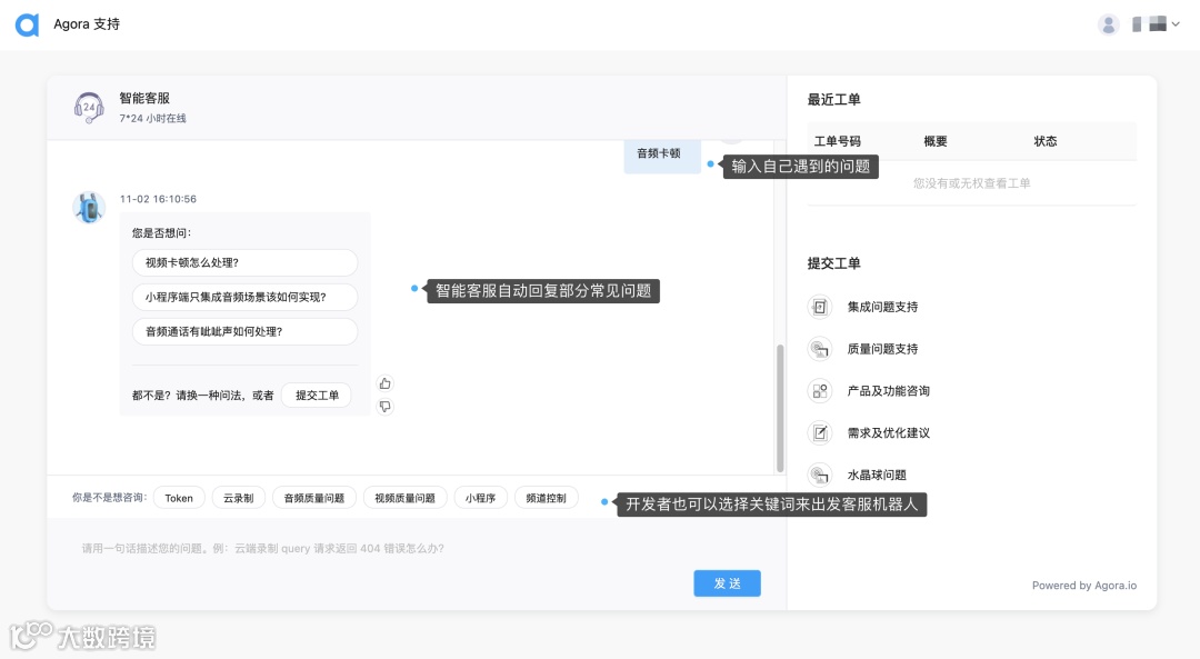 开发者体验一直都是声网最关注的事情之一。产品是否好用,开发过程是否足够友好,技术支持是否及时且有效、用户体验是否稳定等等,都属于开发者体验。为了提升技术支持方面的体验,我们近期上线了两个新模块:智能客服模块与聊天对话模块,并将工单技术支持时间延长至 7*12 小时。