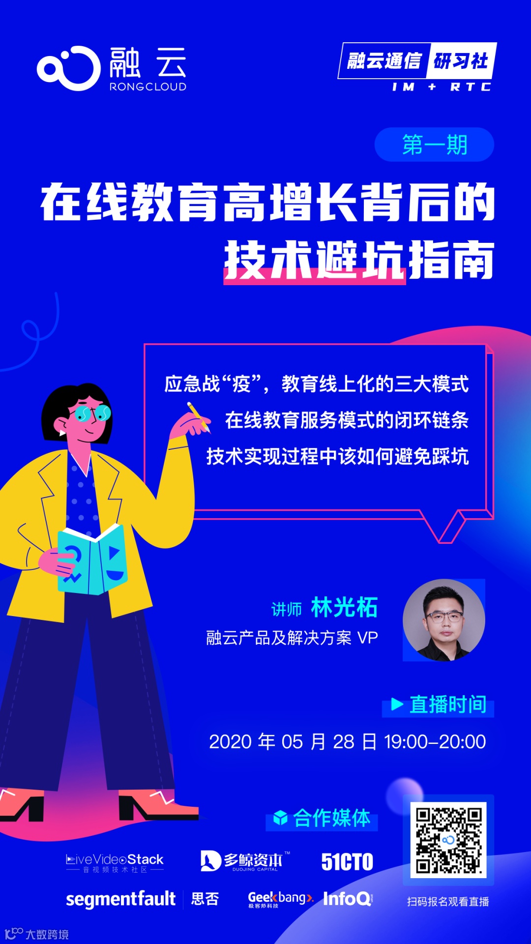 今晚19点,融云产品及解决方案 VP 林光柘,为您带来“在线教育高增长背后的技术避坑指南”,让您避开技术实现过程中的坑点,轻松玩转在线教育新模式!