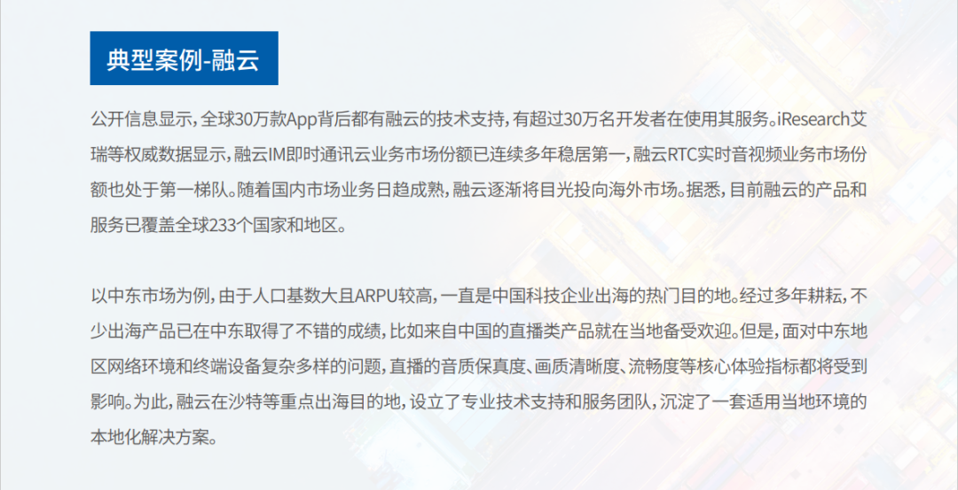 同时,亚马逊云科技联合霞光社共同发布了《迈向世界:2013~2023 中国企业全球化发展报告》,融云入围其“中国企业全球化产业全景图”的 RTC 和企业服务两大类别,并作为助力中国企业推进全球化策略的通信云典型代表单独呈现。