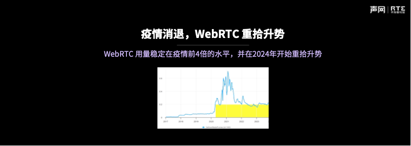 随着疫情的消退,WebRTC 需求虽曾有明显下降,但在 2023 年回归稳定且呈现稳中有升的状态,整体用量是疫情前的四倍。