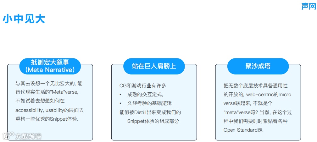第三就是不管是你自己的产品,还是要构建一个项目或者创业,如果我们把这么多微小的 Web-Centric 的 microverse 连起来,使数据相互打通,不就有了一个 Metaverse?所以说这就是一个聚沙成塔的效应。
