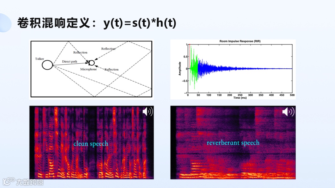 卷积混响是另一个重要的概念,它的数学表达式为:y(t)=s(t)*h(t),也就是麦克风采集的混响语音 y(t) 等于干净语音 s(t) 卷积上房间脉冲响应。