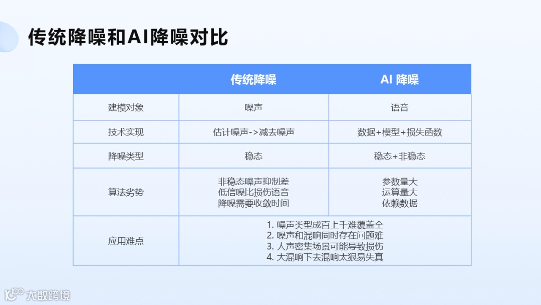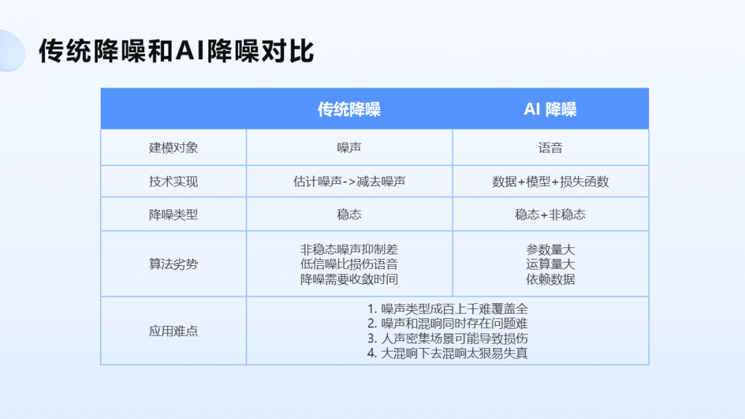 我们前面介绍了降噪和去混响的定义,接下来介绍一下传统降噪和 AI 降噪的对比。
