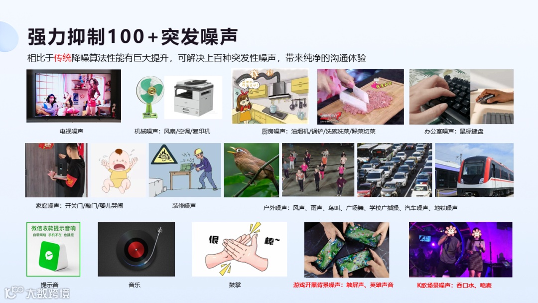 比如居家场景中的电视噪声、风扇噪音、厨房噪声等,户外场景中的风声、雨声、鸟叫声,游戏场景中的背景噪音、触屏声、英雄语音,K 歌场景下的口水声、喷麦声等等,声网的 AI 降噪都可以去除掉。